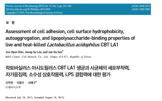 Assessment of cell adhesion, cell surface hydrophobicity, autoaggregation, and lipopolysaccharide-binding properties of live and heat-killed Lactobacillus acidophilus CBT LA1 Joo-Hyun Shin, Joo-Hyun Shin, Joong-Su Lee, and Jae-Gu Seo Korean Journal of Microbiology (2015) Vol. 51, No. 3, pp. 241-248