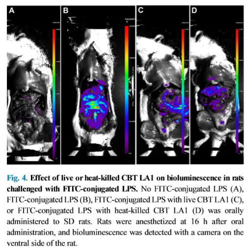 上图1是一韩国学者发表的文章,比较了活性的和热灭活的嗜酸乳杆菌CBT LA1在体外和体内对内毒素的粘附与去除能力,并以此评估其对肠道屏障保护作用。研究者对此进行体内成像,以评估活的或热灭活的CBT LA1在感染的大鼠模型中从肠道中去除LPS的能力。