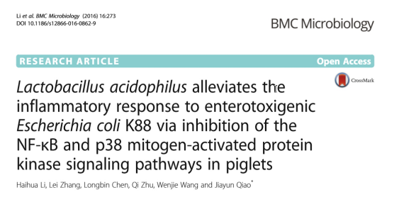 Lactobacillus acidophilus alleviates the inflammatory response to enterotoxigenic Escherichia coli K88 via inhibition of the NF-κB and p38 mitogen-activated protein kinase signaling pathways in piglets Haihua Li, Lei Zhang, Longbin Chen, Qi Zhu, Wenjie Wang and Jiayun Qiao BMC Microbiology (2016) 16:273