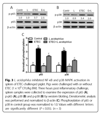 嗜酸乳杆菌通过抑制ETEC诱导的TLR2和TLR4表达,从而抑制仔猪NF-κB和MAPK信号传导的不同步骤的激活,减缓NF-κB和MAPK的磷酸化,减少促炎细胞因子的产生,以及上调负调节因子和抗炎细胞因子。 结合本文提供的结果,研究者们推测嗜酸乳杆菌通过抑制仔猪中的NF-κB和丝裂原活化蛋白激酶信号传导途径来减轻对ETEC的炎症反应。