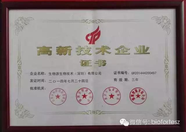At the end of 2014, Bio-Biotech (Shenzhen) Co., Ltd. also passed the news. I was awarded by the State Ministry of Science and Technology, the city commission, the Municipal Finance Committee, the IRS, the Inland Revenue Department assessed the first batch of national high-tech enterprises in 2014. Recently, our company received a national high-tech enterprise certificate, since the high-tech enterprises identified within three years, will enjoy the relevant preferential policies, while the company to accelerate the development to create the conditions.